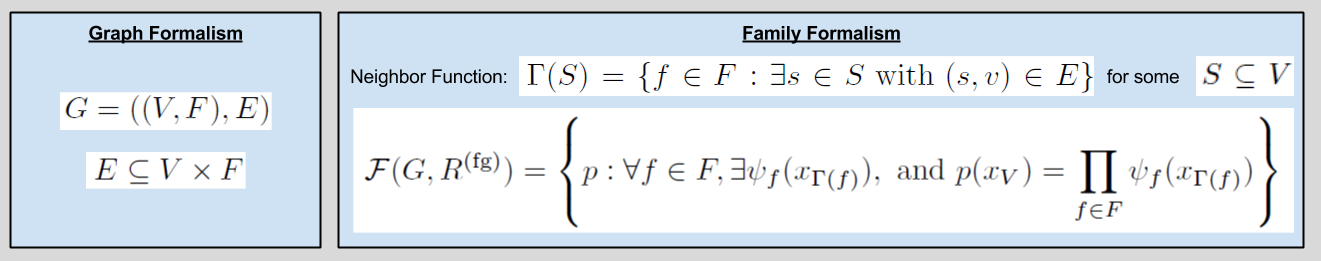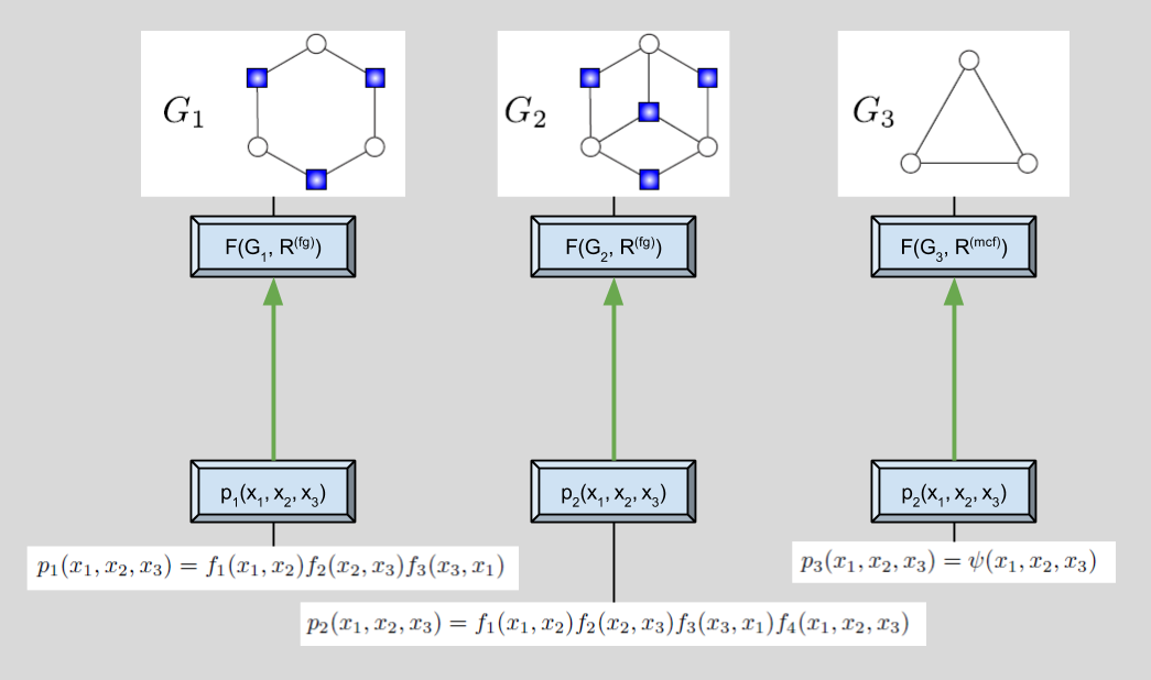 - The leftmost family represents the semantics of factor-graphs R(fg), along with a set of factor-nodes, vertex-nodes, and edges G1. Just as in the factor-graph example above, its corresponding probability distribution is derived from these two elements: each term corresponding to one factor-node and its neighbors.