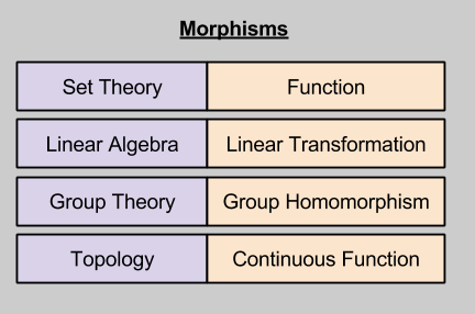 It turns out that another interesting property to read out of maps is endomorphism: a map of an algebraic structure to itself. That makes three interesting properties. Let us explore how the sets of homomorphisms (a homomorphism is an general instance of a morphism, kind of like the instantiation of an abstract class in computer science) relate to each other: