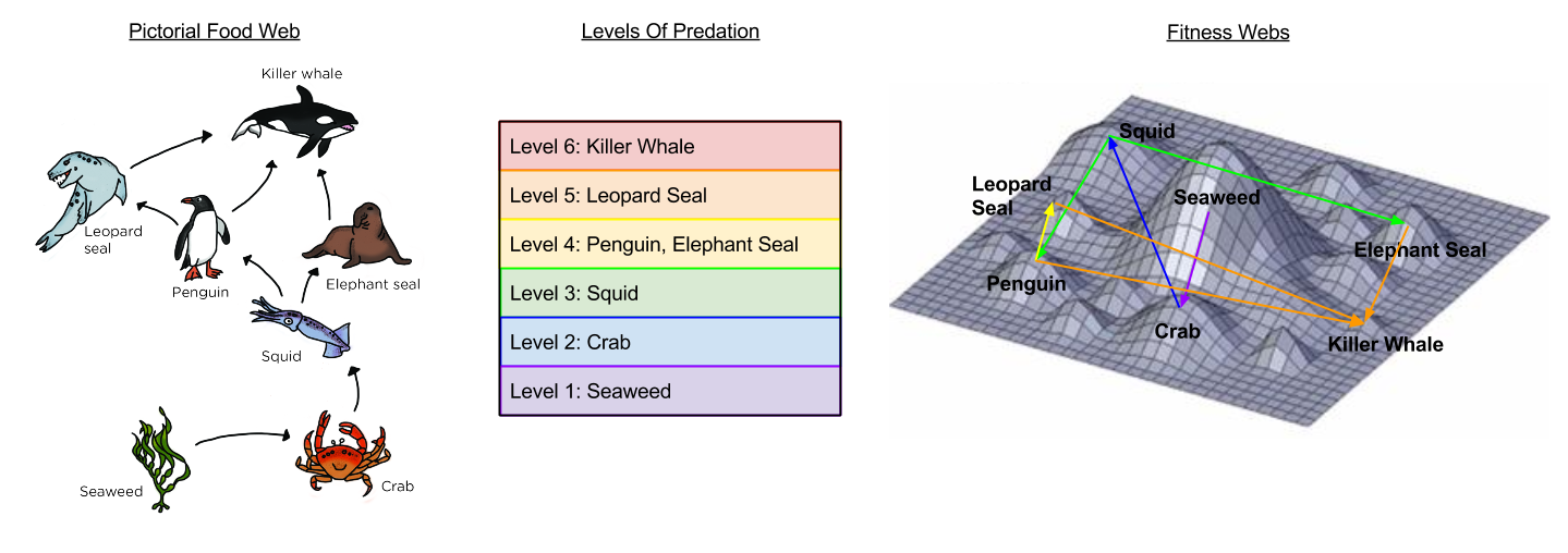We can encode food webs into fitness landscape as follows. Diminishing peak size represents energy loss.