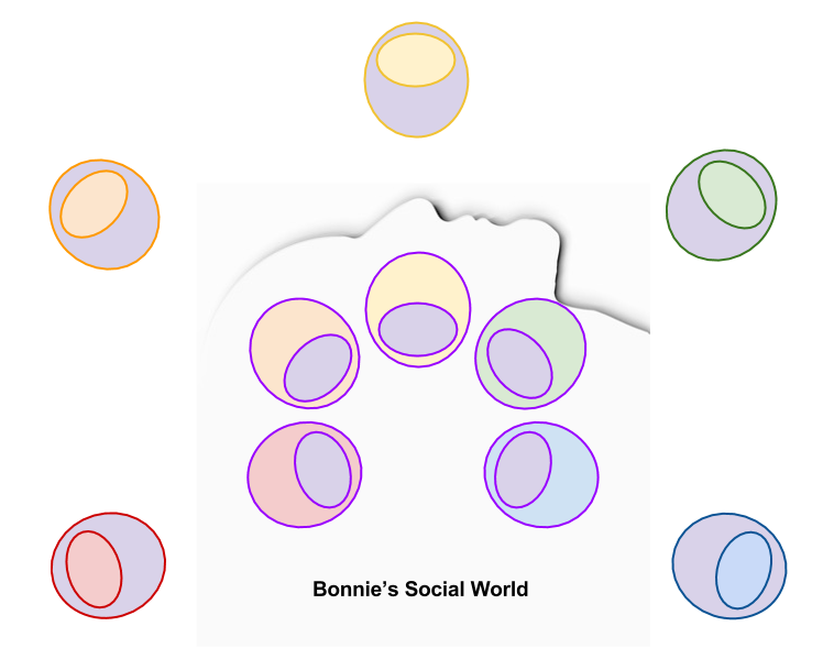 Notice how every person has a color: Clyde, for example, is orange, and Bonnie is purple. Within Bonnie’s mind, her primary models of other people are large ovals, and secondary models are nested inside. Since the large ovals describe other people, they have a variety of colors. Since the nested ovals capture who you are to these people, they are all the same color (in Bonnie’s case, purple).
