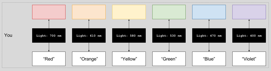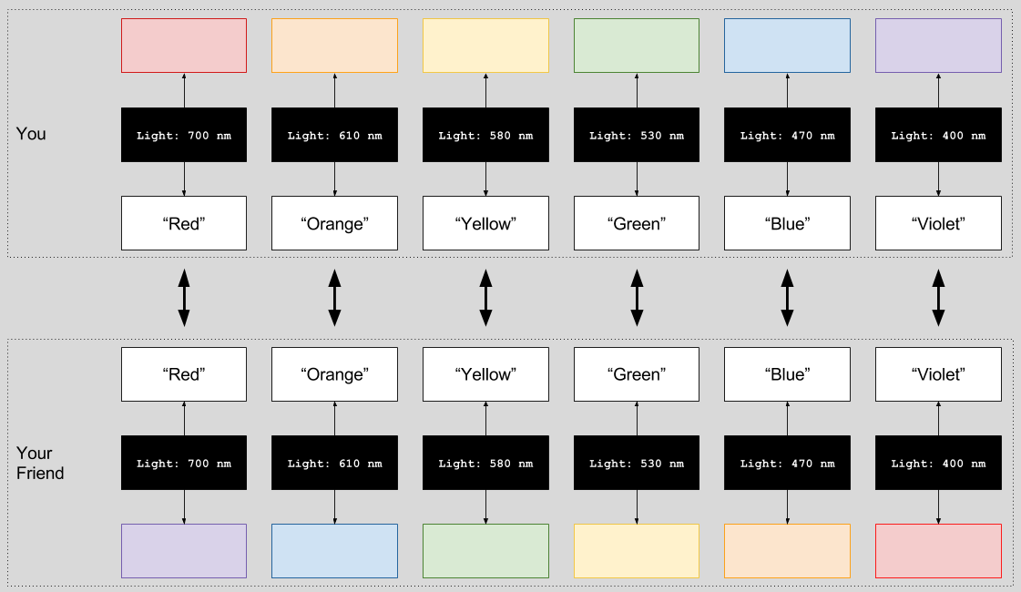 If you take a moment to chew on this hypothetical, a truly frightening outcome comes into view. Your friend could never learn she has a disorder. In childhood, she would acquire the exact same facts about 700 nm light, and learn the same word to denote this sense data. She would be in full agreement with her peers when they say, for example, “that apple is red”. She would pass any color test. And yet, something unsettling remains…