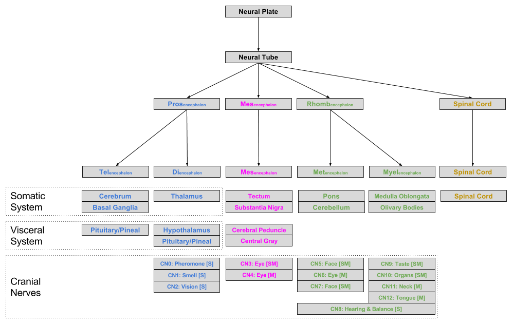 Developmentally, the neural tube can be divided into five regions: tel-, di-, mes-, met-, and myel- encephalon.