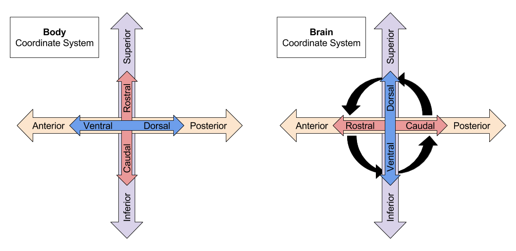 Because of the bend in the human neuraxis, “front & back” is in danger of being confused with “top & bottom”.