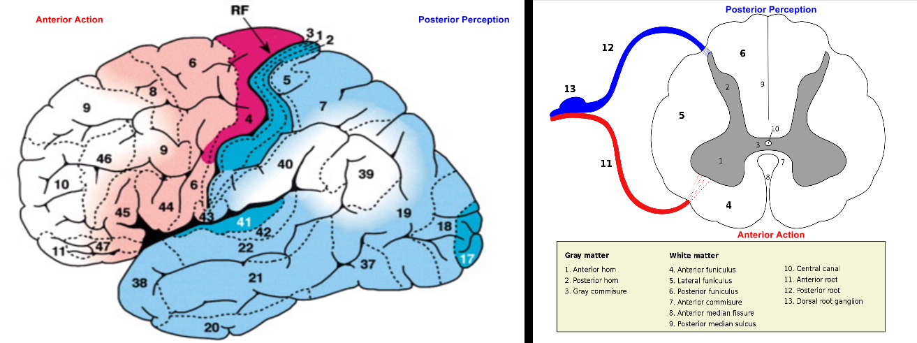 The neural tube develops under several organizing principles. One of the most important is the Bell-Magendie law: in the nervous system, motor nerves & computations happen in the front of an animal (anterior action), perceptual nerves & computations are at the back (posterior perception). This principle applies to the entire nervous system, from the spinal cord to the neocortex.