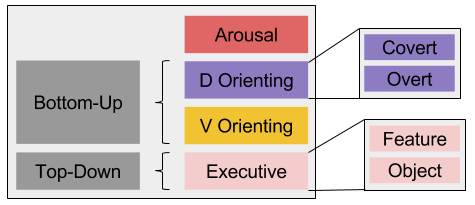 The Orienting network produces Bottom-Up (“externally-driven”) attention. Its dorsal arm contains mechanisms for covert and overt orienting.