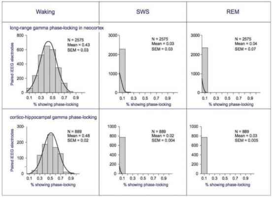 Phase locking can be observed in the electrical rhythm of the brain, as measured by the electroencephalogram (EEG). Phase locking is only observed during the wakeful state, disappearing with the onset of Slow Wave Sleep (SWS).