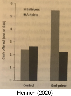Both believers and atheists offer about $2 on their own accord. But, when thoughts of God are unconsciously primed, the offer of believers increases dramatically.