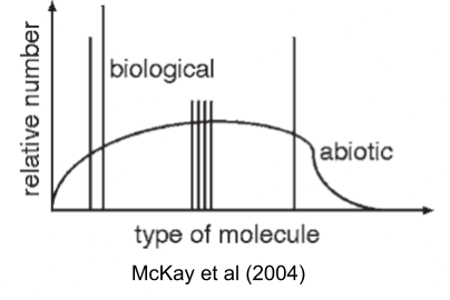 McKay (2004) captures this puzzle visually: nonbiological chemistry produces smooth distributions of organic molecules, but life uses only a sparse set of spikes against that background.