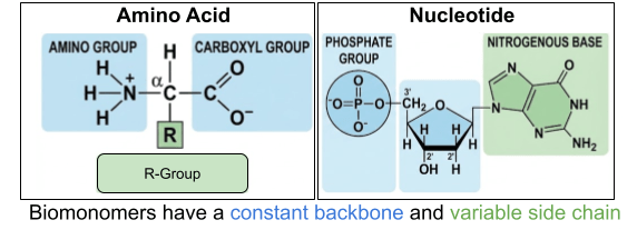 Most of our discussion will center on proteins and nucleic acids. Their constituents are themselves large, complex molecules. These monomers are built on an unchanging backbone and a variable side chain. For nucleotides, there are 4 available side chains (purine and pyrimidine nitrogenous bases). For amino acids, there are 20 available side chains (nonpolar, polar-uncharged, polar-positive, polar-negative R groups).