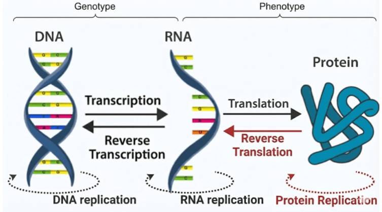 The Central Dogma describes the flow of information in biopolymers. The black arrows are allowed processes; the red arrows are not observed. Proteins cannot replicate because they are incapable of base pairing. Once information gets into a protein, it cannot get out again!