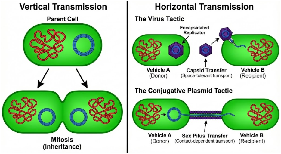But virulence and conjugation are extremes. While virulent viruses are indifferent to cellular fitness, temperate viruses benefit from vertical transmission via the lysogenic cycle. They are thus less pathogenic. Some plasmids cannot construct the sex pilus and are capable of horizontal transmission only rarely. Jalasvuori (2012) shows that nucleic acids can be organized into a continuum: