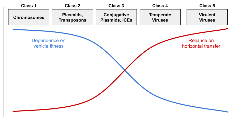 • Class 1-5 all retain addiction modules (a.k.a., MGE stabilization modules) like the toxin-antitoxin (TA) system (Mendoza-Guido & Rojas-Jimenez 2025). Many plasmids produce both a toxin and the antitoxin. Since the toxin has a longer half-life, loss of the plasmid entails death of the host. The restriction-modification (RM) system works in a very similar way (Kobayashi 2001).