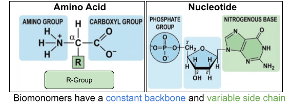 Most of our discussion will center on proteins and nucleic acids. Their constituents are themselves large, complex molecules. These monomers are built on an unchanging backbone and a variable side chain. For nucleotides, there are 4 available side chains (purine and pyrimidine nitrogenous bases). For amino acids, there are 20 available side chains (nonpolar, polar-uncharged, polar-positive, polar-negative R groups).