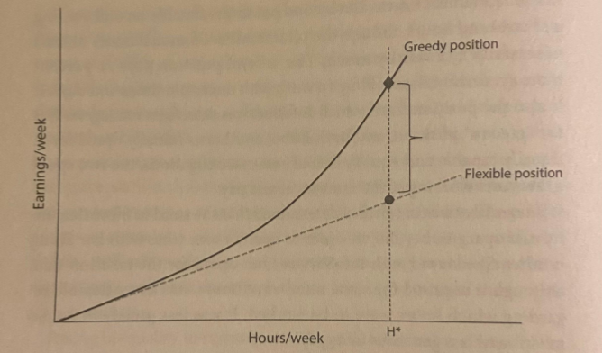 Some jobs offer the same hourly rate to a worker who works 40 hours a week, to those who work 80. This linear payoff has the latter earning twice as much. Call this flexible work. But other jobs offer increasing rates for workers who go above and beyond. On greedy work, one person who works 80-hour weeks will receive significantly more than two people working 40-hour weeks.