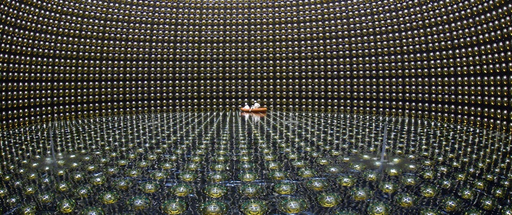 Are you sufficiently creeped out by how many particles pass through you undetected? 🙂 If not, consider neutrino detectors. Because of their weak interactivity, our neutrino detectors must be large, and buried deep inside the earth (to shield from “noise” – more common particle interactions). Here we see a typical detector, with scientists inspecting their instruments in the center, for contrast: