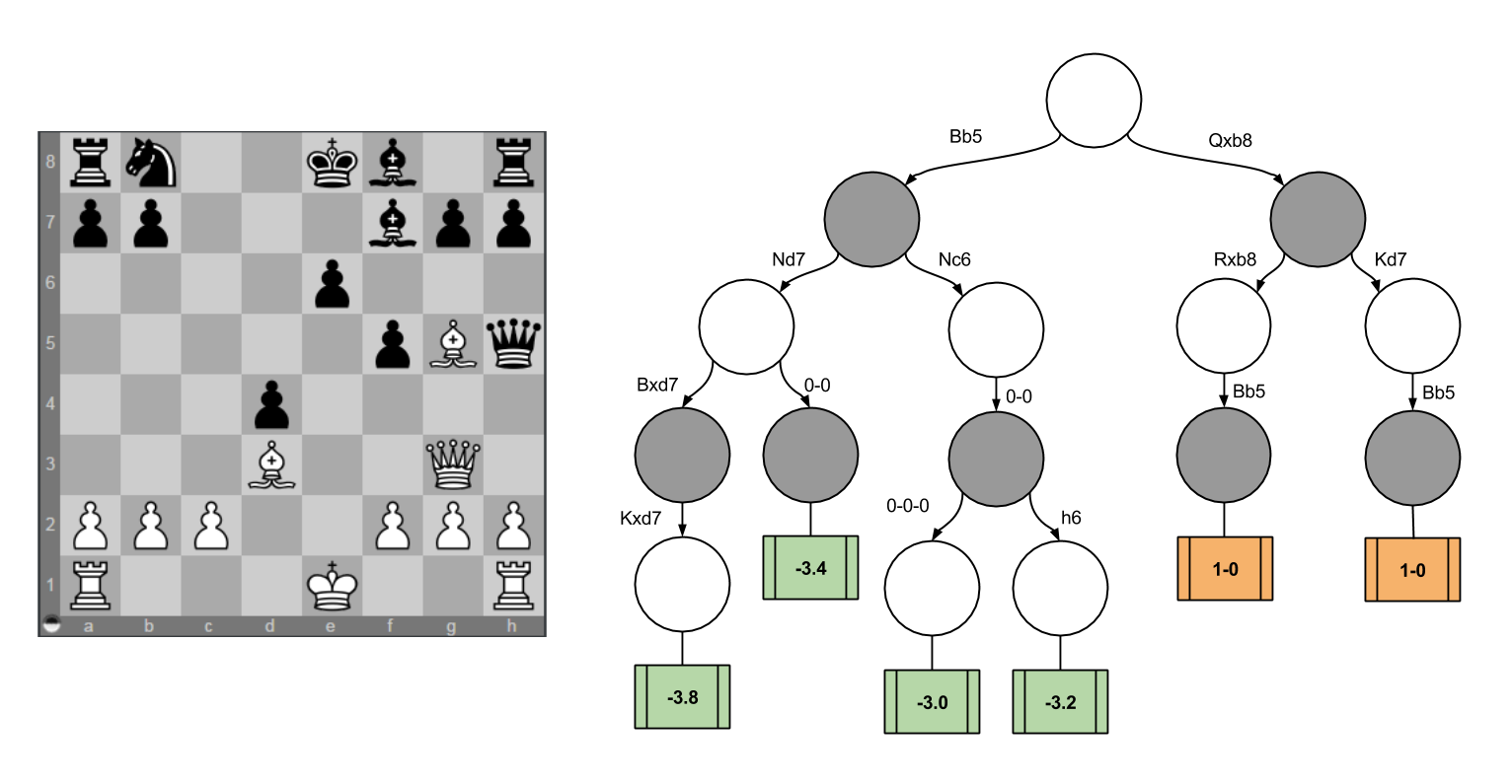 If you consult the minimax graphic above, you’ll see that my preference ordering is { Green > Orange > Purple }. I would explain this in language by appealing to the relevant differences (e.g., “the pawn trade frees his pawns to control the center”). To me, this is evidence for a state comparison tool that is able to zoom in on distinguishing features.